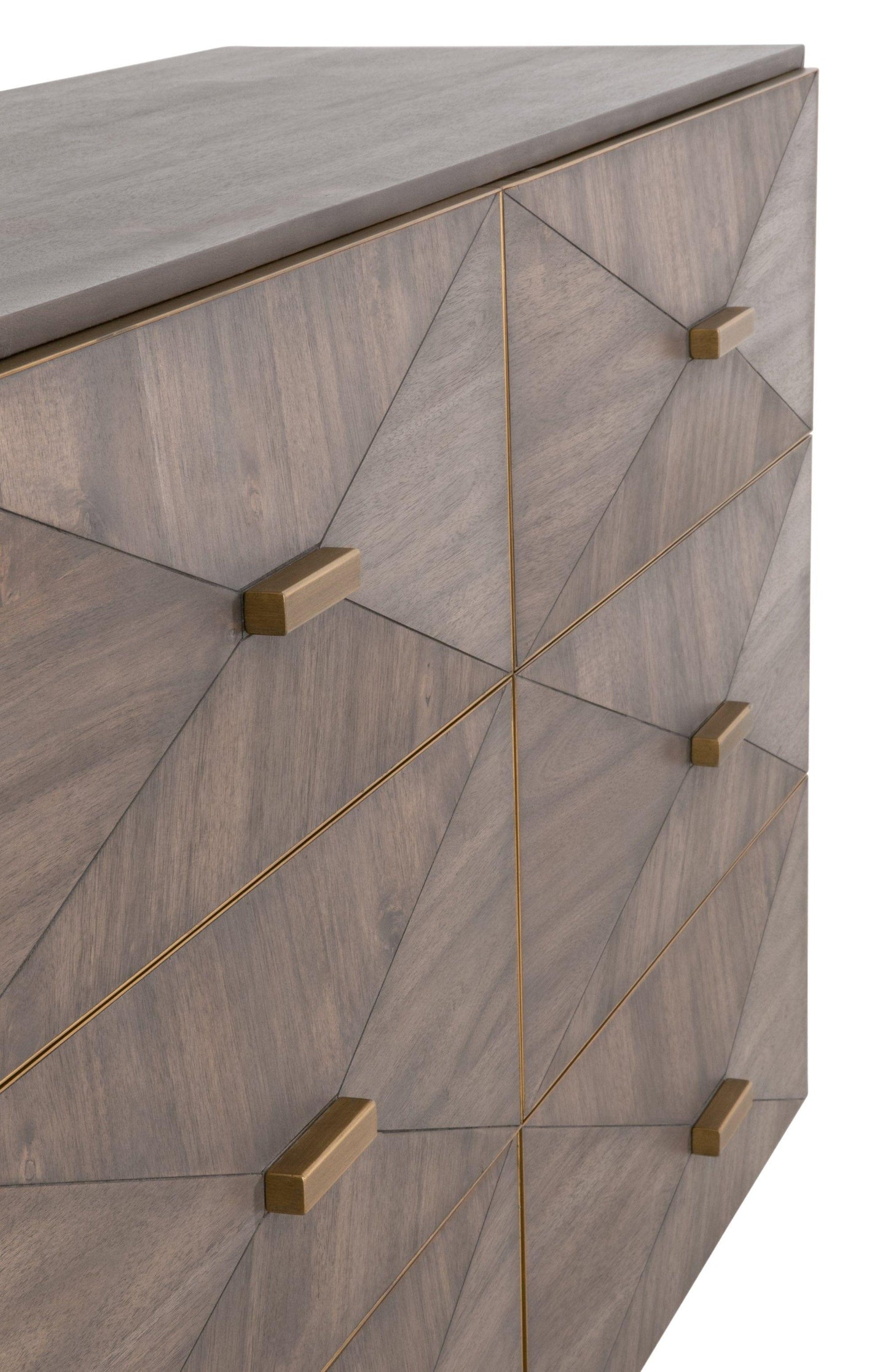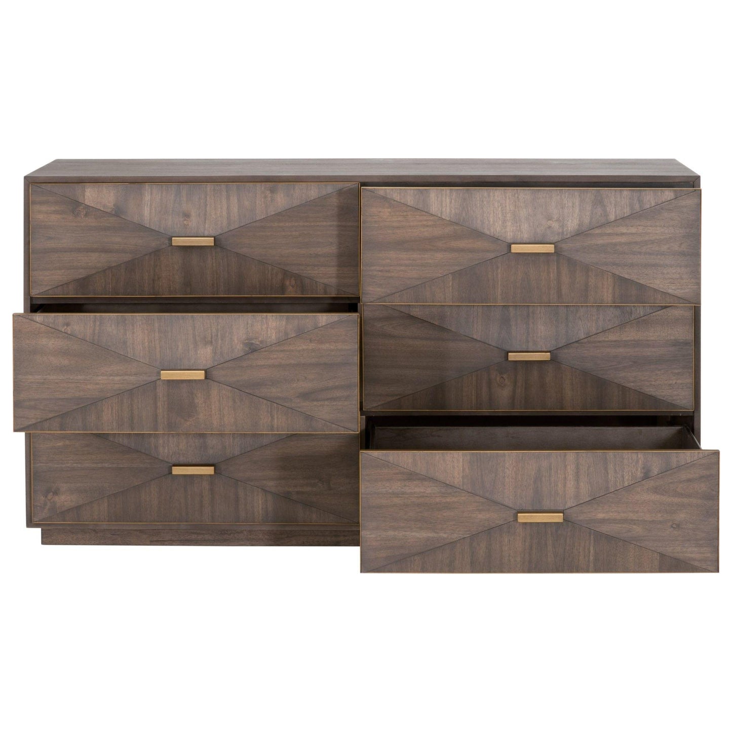 Elevate your bedroom with the exquisite Wynn 6-Drawer Double Dresser. Its acacia veneer boasts a captivating blend of warm shades, enhanced by a 3-dimensional design and delicate brushed gold frame. This dresser offers both aesthetic appeal and practicality with its six generous storage drawers. Adding a touch of sophistication to any room, it transitions your space into a warm and inviting atmosphere. The striking acacia veneer illuminates a range of natural brown hues, complemented by a 3-dimensional pattern adorning the front of the drawers. The elegant rectangular gold handle beautifully ties in with the thin brushed gold metal frame, adding to its allure. The warm tones and versatile design make this dresser a perfect fit for any setting.